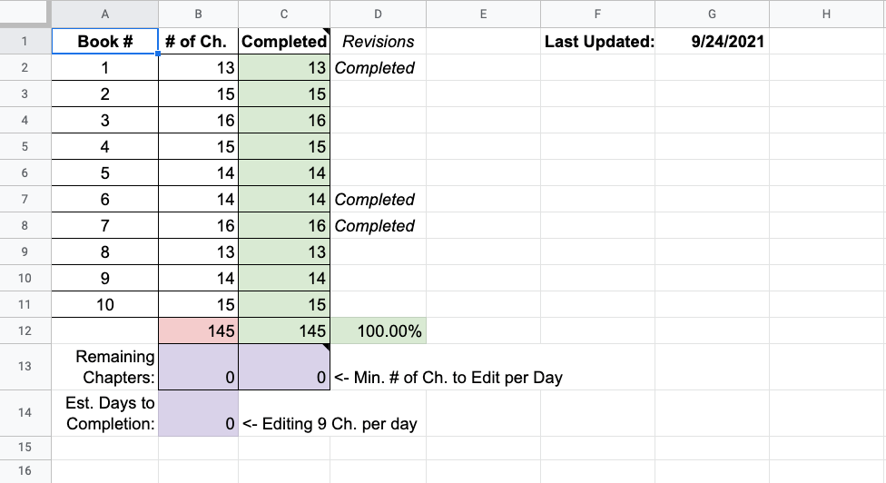 I highly recommend you have a method to track your progress, especially for larger projects. I’m a huge fan of spreadsheets so that’s what I used, but I could easily see someone using sticky notes, a pad of paper, a whiteboard, or perhaps some more advanced tracking software for project management.